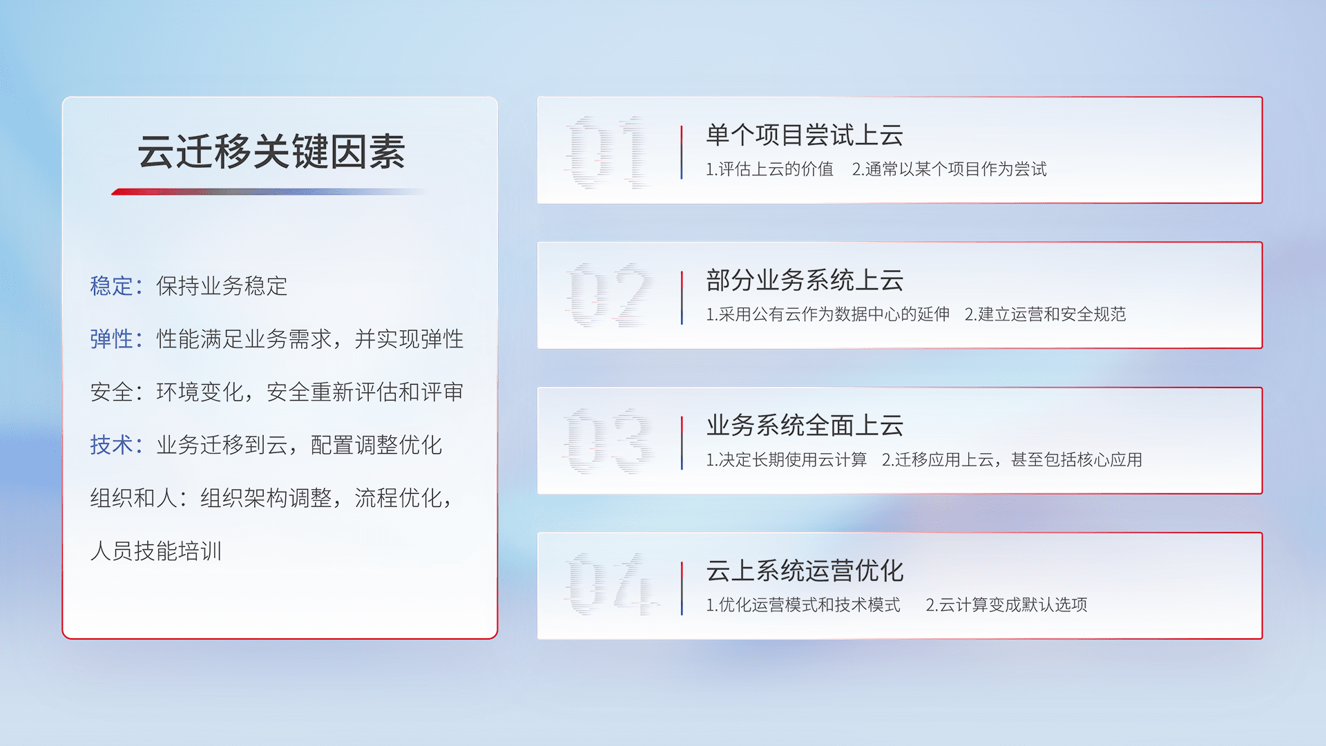 结合实际业务,,从规划设计、、、、云平台选型、、、、云原生改造、、、数据迁移、、、集成交付,,迁移全过程为客户识别最佳上云路径,,,,做好风险识别管理,,,设计网络架构、、身份权限、、、安全审计合规、、、操作审计、、日志审计、、、监控告警策略、、、、多站点容灾设计等,,对云上基础设施进行整体规划,,,提升IT治理水平,,以满足弹性、、、、高可用、、、高性能的需求。。。