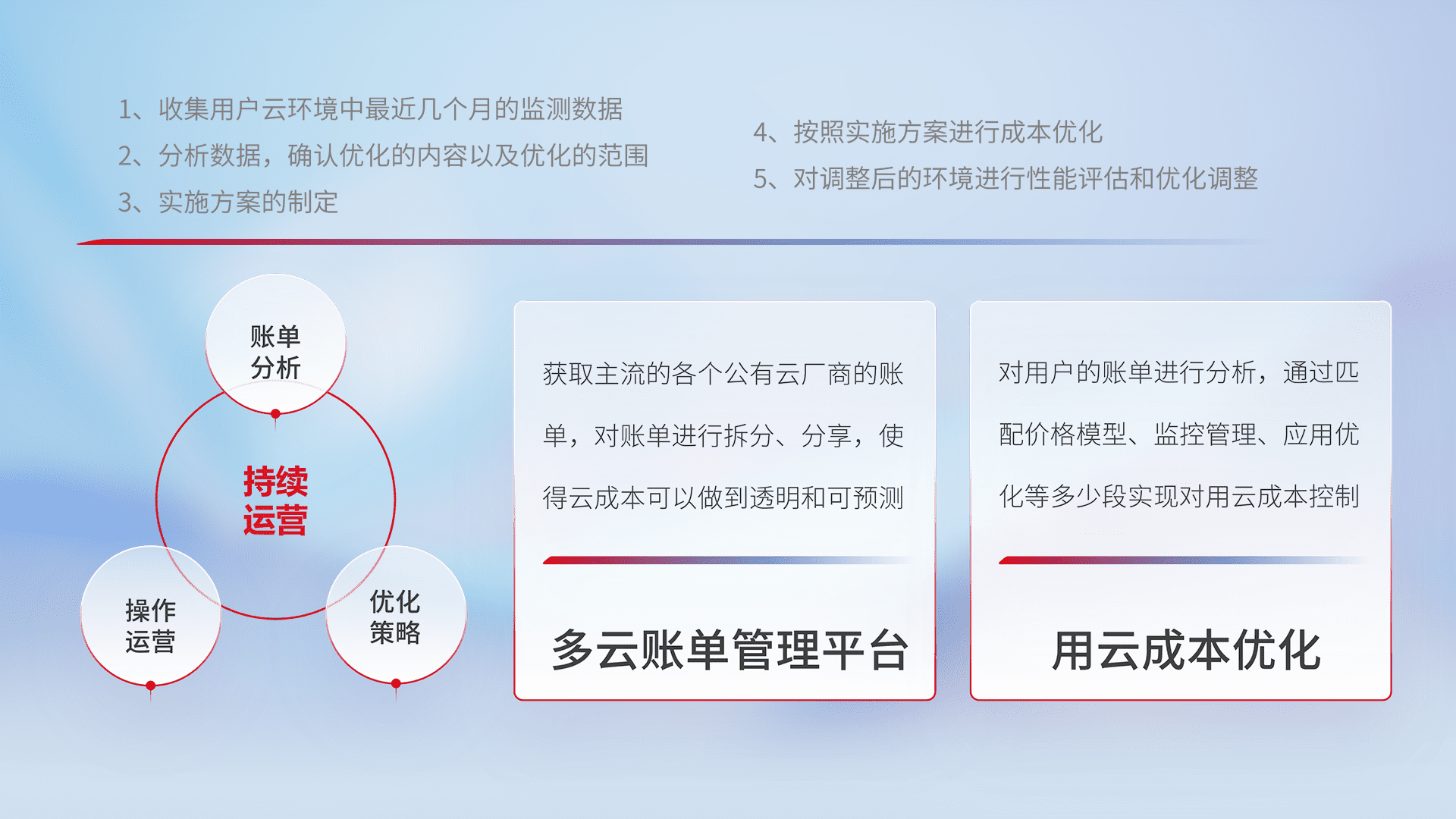 通过多云纳管,,,,以统一的资源数据模型把客户的云资源进行抽象和封装,,进而实现对多云资源的统一操作,,,,保障云资源管理的可靠性、、、稳定性与可用性。。量身定制化运维内容,,,,配置、、、开发运维、、、补丁管理、、备份、、、监控、、、、认证和访问管理、、、、审计和日常巡检等,,保障在用云过程中的可靠度,,,,稳定度以及高可用率。。。